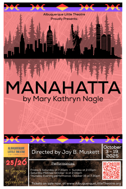 Manahatta is a play by well-known Native American attorney/playwrite Mary Kathryn Nagel and tells the story of the Lenape people’s forced displacement from their homeland, now known as Manhattan. It intertwines their 17th-century history with the contemporary experiences of a young Lenape woman returning to the city. Albuquerque Little Theatre (224 San Pasquale Ave. SW) presents this historic drama starting Friday, Oct. 3 at 7:30 p.m. The play continues Fridays and Saturdays at 7:30 p.m. and Sundays at 2 p.m. through Oct. 19. There will be a special 2 p.m. matinee on Oct. 11 and an additional 7:30 p.m. performance on Oct. 16. Tickets are $39.30 for adults, $35.70 for seniors and students and $33.89 for active military. You can get them in advance at ci.ovationtix.com/36941/production/1237052.
