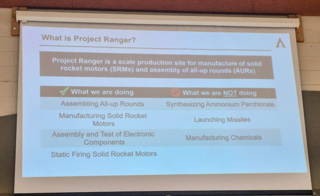 “This will be our scale production site. This will be the factory that is making solid rocket motors and is making what are called all-up rounds,” Kreitz said. “This is a process that’s well understood, well controlled, very tightly regulated. It’s done very safely in many places around the United States.”