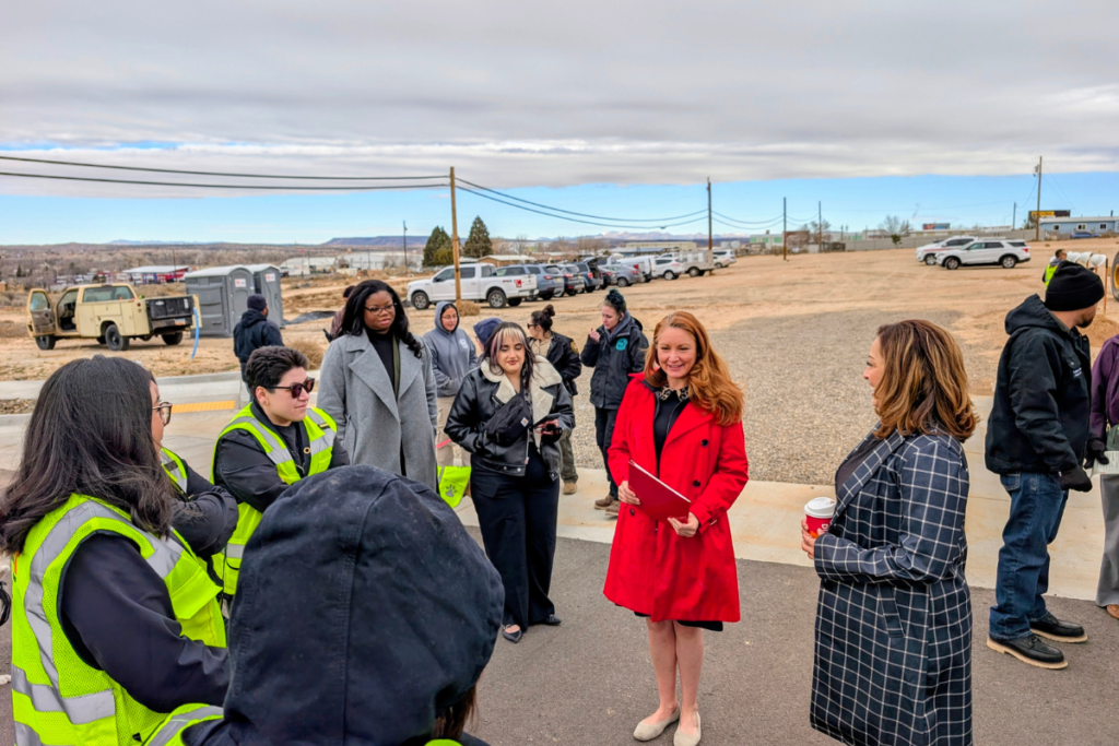 U.S. Rep. Melanie Stansbury talks with members of the all-female construction crew that will build Sandoval County’s Animal Resource Center. (Kevin Hendricks)