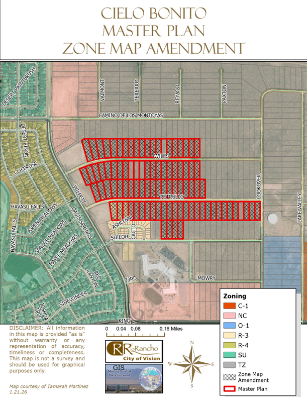 The governing body approved three measures at its Feb. 26 meeting: the Cielo Bonito Master Plan for a 270-home subdivision, a companion rezoning of the site, and a corridor overlay ordinance requiring enhanced setbacks along the full length of Rainbow Boulevard.