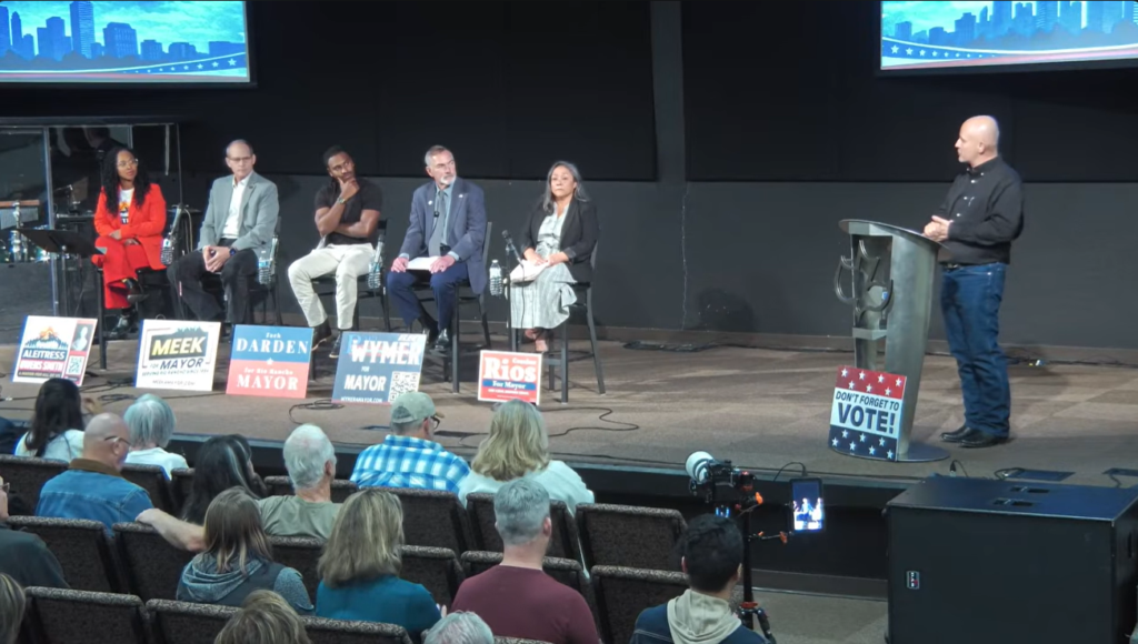 Five Rio Rancho mayoral candidates gathered at a church-hosted forum last weekend and spoke with one voice against sanctuary city status, while staking out sharp positions on drag performances, library materials and the role of city government in policing community morality — drawing sustained applause from a crowd that had gathered explicitly to hear candidates address issues of faith and values.
