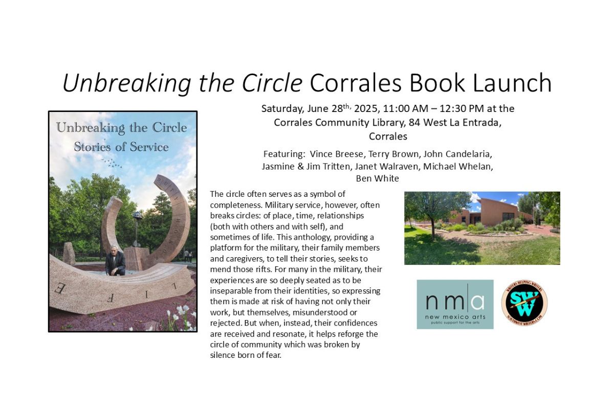 Editorโs note:ย This is a story from โUnbreaking the Circle,โ a military anthology that will launch on June 28 at the Corrales Community Library.ย By Jim Tritten Jasmine and I entered the medicine circle, arm in arm, from the east, the direction of the rising sun and the new day. Dusty tan stones lined the sandy […]