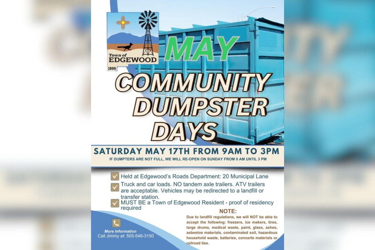 Staff report The Town of Edgewood will hold its “Dumpster Days” community service event on Saturday, May 17. The event is exclusively for Edgewood residents, who will be required to show ID. Hours of operation are Saturday from 9 a.m. to 3 p.m. If the dumpsters are not full, the event will reopen on Sunday […]